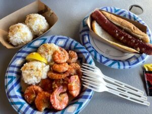 そして、ようやくそのお店に到着しました。名前は「ジョバンニアロハシュリンプ」というトラックのお店です。そしてそのお店に行くと行列ができていて、やはり人気店なんだろうと思いました。私はガーリックシュリンプ、追加のご飯、ホットドッグを注文ました。ホットドッグを頼んだ時に、Rice or Bun(バンズ)?と質問され、ホットドッグにご飯なんかあるのだと思いました。私はバンズを注文しましたが、海外ではお米のホットドッグも人気なのかなと思いました。