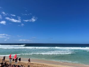 実際にサーフィンを観戦したのは初めてでしたのでとても貴重な経験となって良かったです。あんなに大きい波の上を滑られるというのはすごいなと思いました。写真でそのダイナミックさを完璧にお伝え出来ないのが少々心残りですが、写真の2倍は大きく見えます。