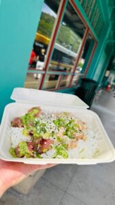 ここは有名なテイクアウト専門のポケ丼のお店です。ハワイ大学から更にバスで15分ほど行った山の中にあります。近くに緑色の外装をしたスターバックスがあり、そこも有名です。ここのマグロは口に入れた瞬間溶けます。味付けの種類が何個もあるのですが、私のおすすめは、スパイシーとジンジャー味です。またトッピングも、天かす、ふりかけ、ネギなどあるので、お好みで選ぶことが出来ます。ワイキキから少し離れているのですが、時間がある方は是非行ってみてください。