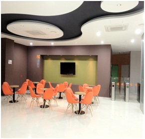 一階が寮の入り口で、そこには警備員さんが常にいます。中に入ると、左側がテレビや椅子があるラウンジになっていて、右側がパソコンルームになっています。また、洗濯室も一階にあります。