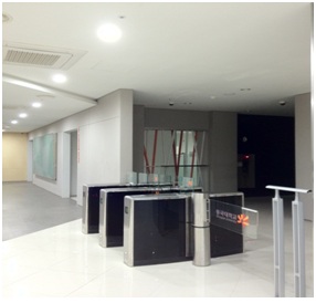 左側に男子寮の入り口、右側に女子寮の入り口があり、どちらも改札口のようになっています。こちらもカードキーを使います。電車に乗るときのように、カードをタッチすると入ることができます。
