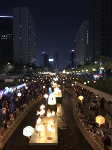 清渓川(チョンゲチョン)は朝鮮時代以前から続く歴史のある河川で、経済成長期に都市化が進み一度は道路になった場所を、2005年に行われた復元事業によって憩いの場所となったそうです。