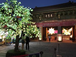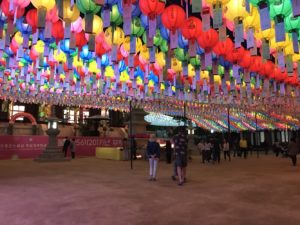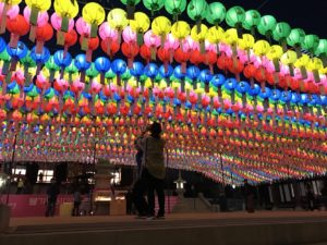 韓国では5月4日の釈迦誕生日(旧暦4月8日)を祝うために2,3週間前からカラフルな提灯で装飾が行われます。私が通う東国大学は仏教学科があり、学内にお寺もあるため、同じように学内の所々で提灯が飾られていました。