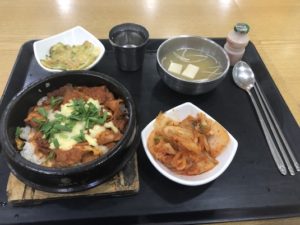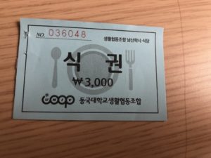 ①まずは、寮の前にある食堂について紹介します。東国大学は、現在食堂が2つあります。1つは、大学の校舎側にありもう1つは、私が現在住んでいる南山学舎の目の前にあります。目の前にある食堂では、南山学舎に住む学生なら、目の前にあるカフェ(前々回に布団セットを買ったところです)で、食券を10枚で30,000ウォン(3,000円)購入して日替わりメニューを食べることができます。10枚で3,000円高いと考えている人もいるかもしれませんが、この定食1食3,500ウォン(350円)なので、得です!!!!私は、安くておなか一杯食べることができるのでそこで夜はよく食べています。しかし、日曜日は開いていないので校舎側にある食堂で4,000ウォン(400円)で食べています。日曜日なら、その食券でご飯を食べることができますが、ちょっと面倒くさいので、4,000ウォン払ってます。コンビニもありますが、高いうえ栄養も偏りそうなので食堂を愛用しています。