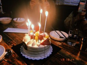 ②次に、韓国人学生の友達の誕生日を祝いました。なぜ、これを書いたのかというとここで文化の違いを発見したからです。メンバーはほかの大学から来た留学生5人(私含む)でその友達を祝いました。一緒に食堂でご飯を食べて、そのあと場所を移してケーキを食べました。そこで驚くことがありました。まず、お店に持ち込んでも大丈夫という点です。韓国では、日本と違い飲み物とかは普通に持ち込んで大丈夫です。ただ、ホールケーキを持ち込めることまでできる店もあるとは知りませんでした。日本では信じられない行為です。次に、日本では誕生日の人が主役なので、ケーキを切るときもほかの人が切ってあげるという文化ですが、韓国では誕生日の人が切るという点でした。これは、その場にいた全員がこの文化の違いに驚くということがおきました。誕生日おめでとう!!!!!
