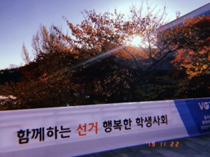 ちなみに、現在(11月25日現在)大学内で学生会(?)の選挙中なのでこのような宣言旗がまかれています。