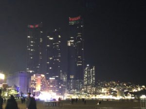 こちらは、夜の海雲台海水浴場から見たビルやアパートの写真です。余談ですが、私はPSYCHO-PASSという、アニメが好きなのですが、そのアニメの舞台に雰囲気が似ているため思わず撮ってしまいました。