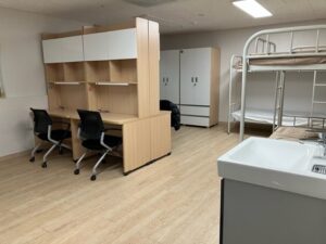部屋は4人まで使用できるようになっていて、机とクローゼットが4つ、2段ベットが2台、洗面台と靴箱と冷蔵庫が1つずつ設置してあります。シャワールーム、キッチン、ランドリー、トイレは共用です。