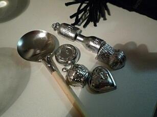 これが占いに使用する道具で、このスプーンの上に様々な形をした鉛を置いて、火で炙り溶かします。それを冷水に流し込み、出来た形が何に似ているかで今年の運を占うのです。