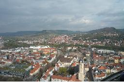 写真はタワーから撮影したイエナの街です。回りを山に囲まれた小さな街で、地下鉄(Uバーン)、市内を走る電車(Sバーン)はありません。移動は、バスかトラム(市電)、徒歩になります。坂の多い街で、路地が入り組んでいます。