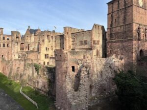 (1枚目:めちゃくちゃ長くキツい坂道 2枚目:ハイデルベルク城からの光景 3枚目:城壁 4枚目:世界一大きいらしい酒樽)