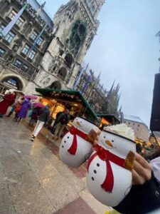 11月27日からはクリスマスマーケットが開催されていて、伝統的なクリスマスの飾りや、Glühweinなどを飲むことができます。ミュンヘン中の至る所で開催されていて、それぞれ特色があるので見ごたえがあります。さらに、Glühweinのコップは買うこともできるため、クリスマスマーケット限定のデザインのコップはお土産にもピッタリだと思います。また、この時期にはTollwoodと呼ばれるお祭りがあり、そこではかなり大きなフリーマーケットも開催されるのでお土産を探すのにいいです。ドイツの冬は東京と比べるととにかく寒くて、日が暮れるのも早いし厳しい季節であることは変わりありませんが、そんな中でもクリスマスマーケットや蝋燭の光が灯った家、温かいワイン、クリスマスの心温まる絵本、映画、音楽など、その時期ならではの楽しみがたくさんあるので、12月も待ち遠しいです。