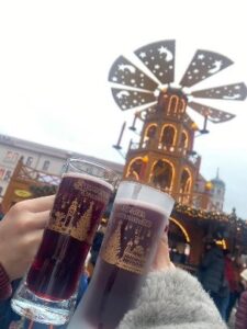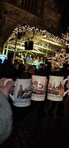 そして、Münchenはもちろん、RegensburgやAugsburg、Nürnbergなどの様々な街のクリスマスマーケットに行きました。私はドイツに来るまでクリスマスマーケットの存在を知らなかったのですが、街ごとに雰囲気が違ってとても楽しいです。そしてもちろんGlühweinはどこのクリスマスマーケットにも売っていて、オリジナルのマグカップも買えるので必ず飲んでいました。ただ、アルコール度数はそれなりにあるので、飲みすぎには気を付けないといけません。