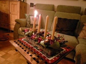 12月に入ると、ホストマザーはまず、ろうそくを灯しました。ドイツは伝統的に、四つのろうそくを用意して、クリスマスまでの各週に一つずつろうそくを灯すそうです。また、私のホストファミリーはいつもご飯を食べる時に音楽をかけるのですが、12月はずっとバイエルンの伝統的なクリスマスの歌でした。“Heilige Nacht”(きよしこの夜)はもちろんのこと、バイエルン方言の楽しい童謡など、私はアメリカのクリスマスソングしか知らなかったため、ドイツの伝統的で情緒深かい音楽は新鮮でした。そして、デザートには、お手製のPlätzchenというクッキーとGlühweinを一緒に食べました。