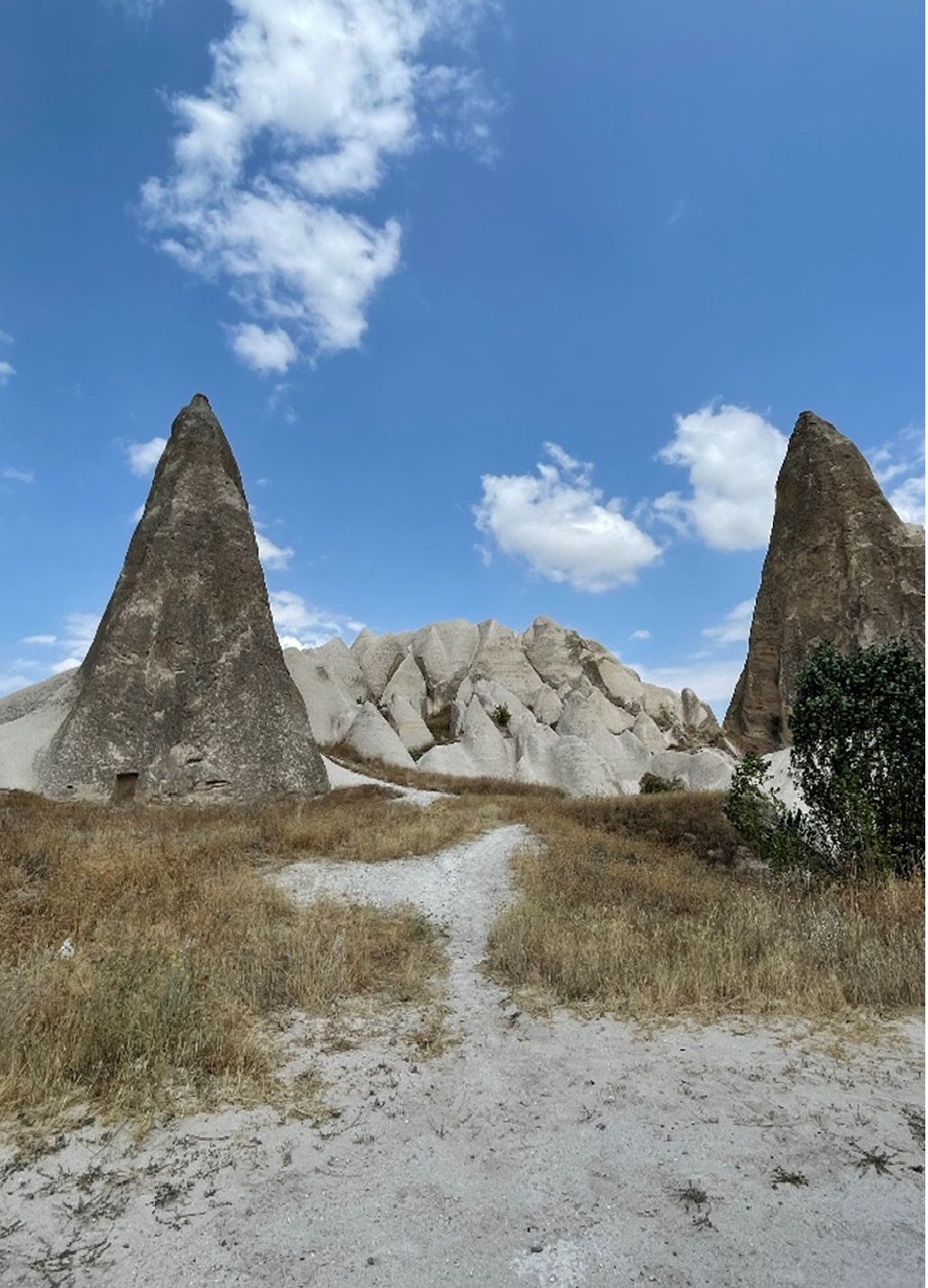 その後、荒々しい運転のシャトルバスで洞窟ホテルに向かいました。洞窟ホテルの頂上はアラビアンな絨毯とクッションでくつろげるようなスペースになっており、そこから見える夜景がとても美しかったです。カッパドキアは独特な形の岩山と、その無数の岩山を眺めることができる気球が有名な観光地です。気球は天候により上がるかどうかは運次第なので、気球の予約はせずラブバレーという有名な眺望スポットから気球を眺めることにしました。