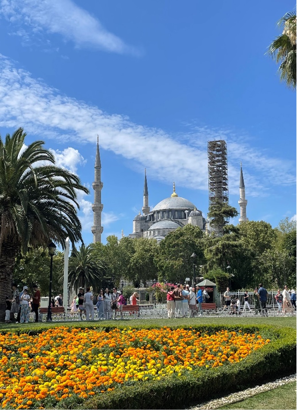 髪の毛を隠すためのスカーフを借り、ブルーモスクの中に入ったのですが、近くで見るブルーモスクは一段と美しく、見とれてしまいました。アヤソフィアも何年か前までは無料で入ることができたのですが、オーバーツーリズムにより本当の目的であるお祈りに支障をきたすという理由で、入場料がかかるようになってしまいました(もちろんお祈りの方は入場がかかりません)。