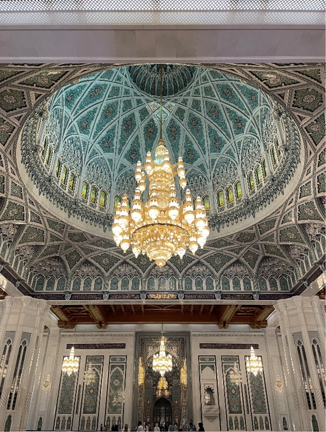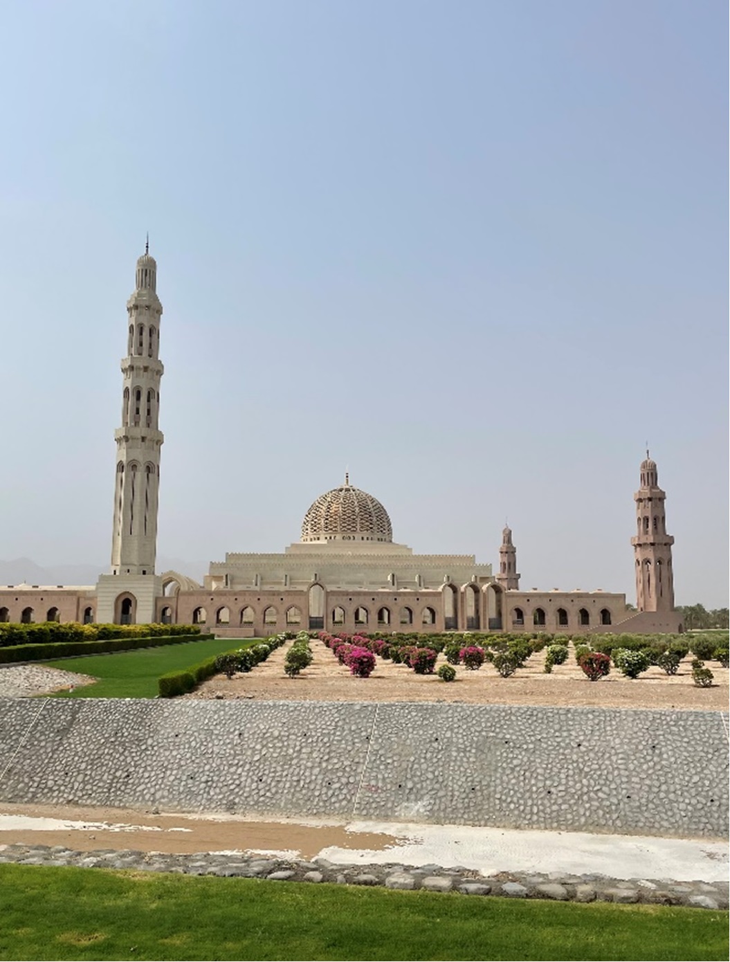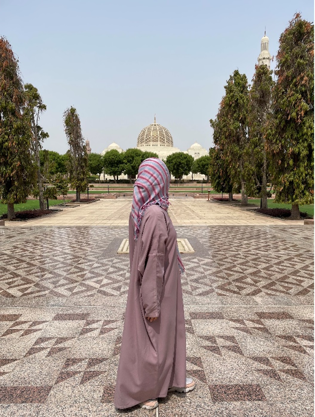 到着したバスに乗って最初に世界で二番目に豪華と言われているスルターンカブースグランドモスクに行きました(一番はアブダビのシェイクザーイドグランドモスクと言われています)。半袖で行ったのですが、中に入ろうとすると何か羽織るものはないかと聞かれました。持ってないと答えると3リアルで肌と髪を隠すアバヤとスカーフを借りる必要があると言われました。ちなみに、上着を持っていたらスカーフのみで大丈夫なので、2リアルでスカーフを買うという選択肢もあります。