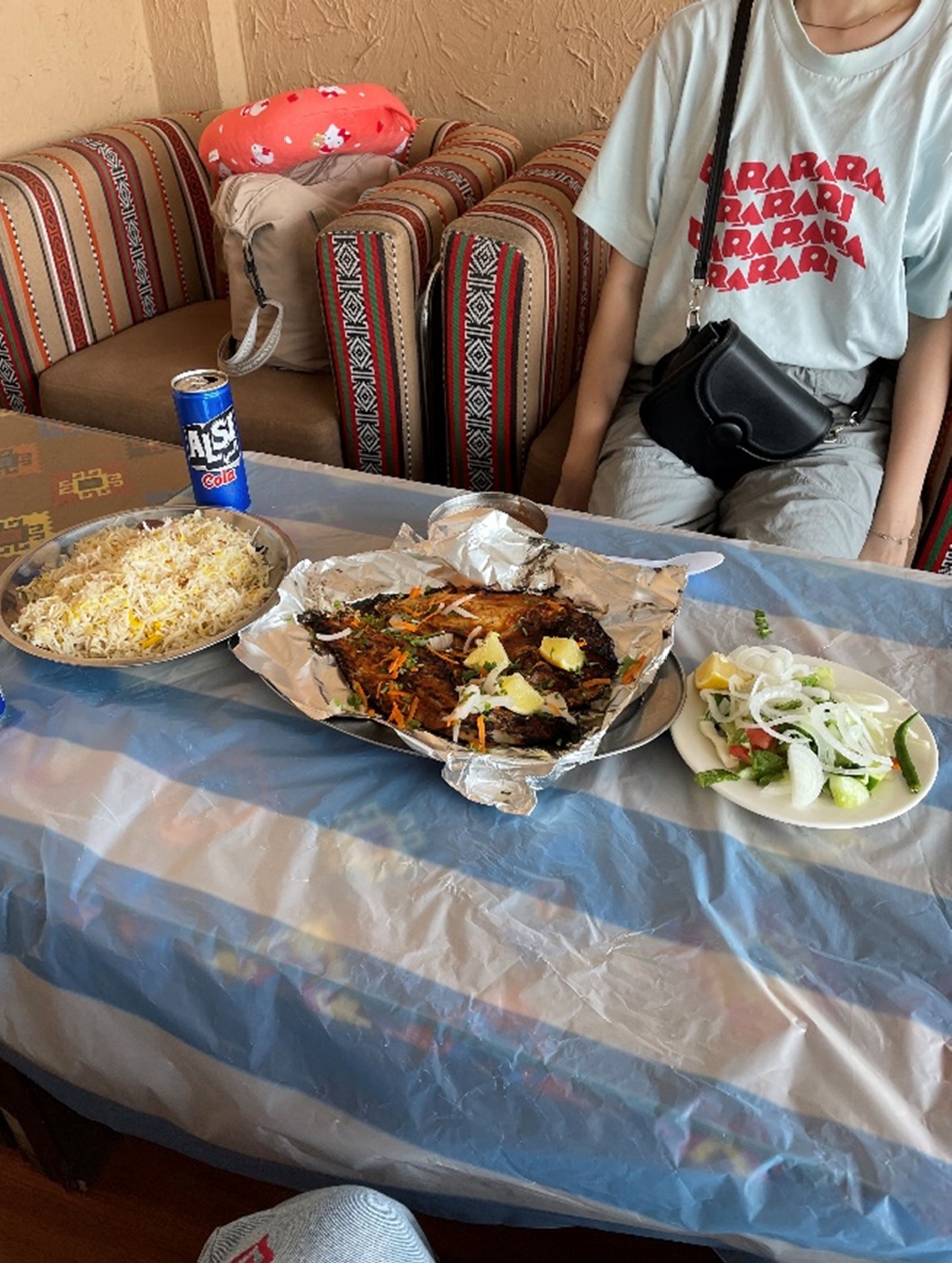 届いた魚料理はとても美味しく、なんと2リアルだったのにご飯とサラダもついていました。二人にしては少し量が多かったのですが、おいしいのと残さず食べたいという意地が働き、米の一粒も残さずに食べきったら、よほどうれしかったのか店員さんがお米のお代わりを勧めてくれました。さすがにお腹がいっぱいだったので断ったのですが、そのほかにも冷房が一番当たる席に案内してくれたり、頻繁に美味しいか聞きに来てくれたりとオマーンの方たちの親切な接客に心が温まる経験でした。