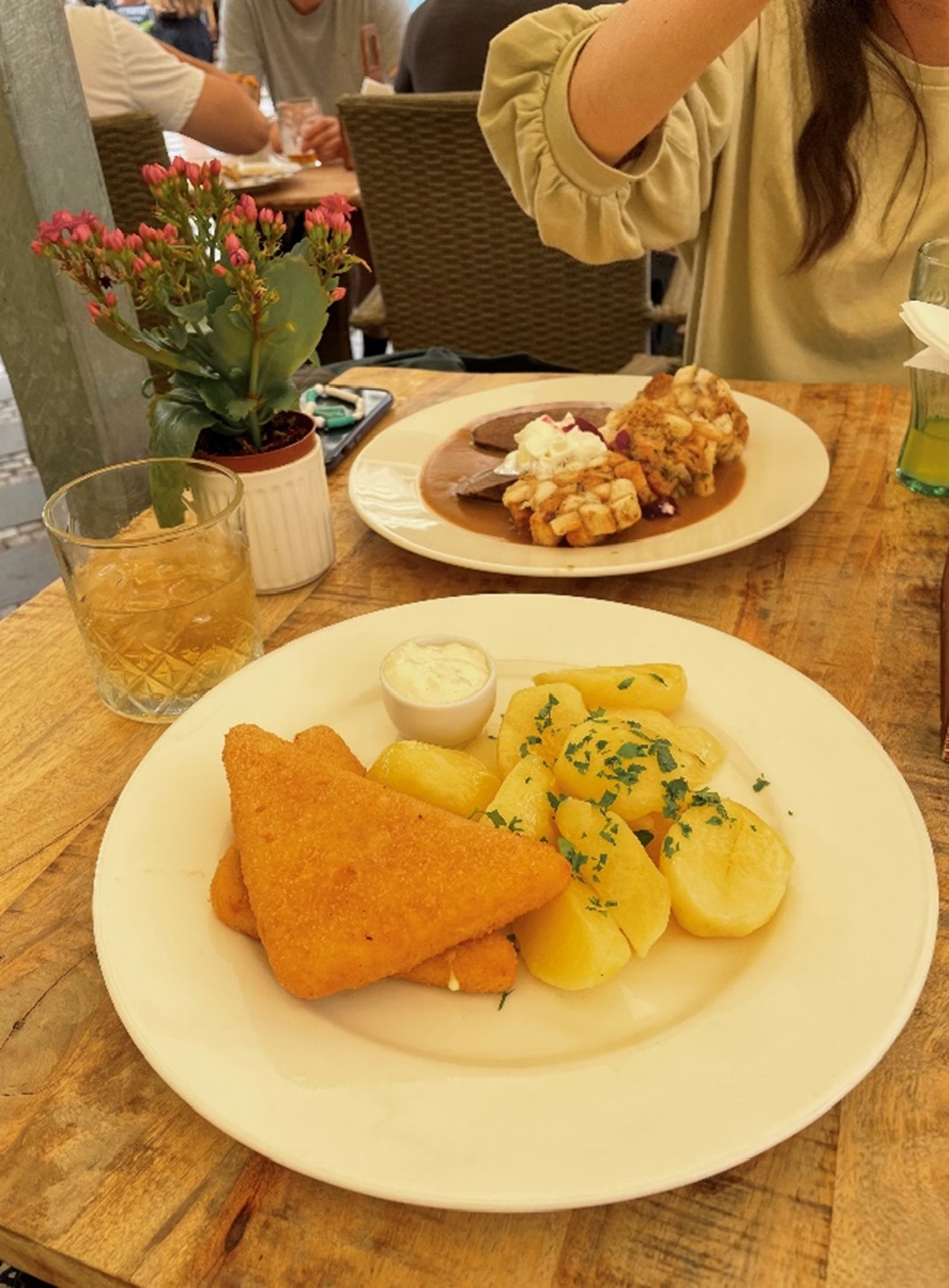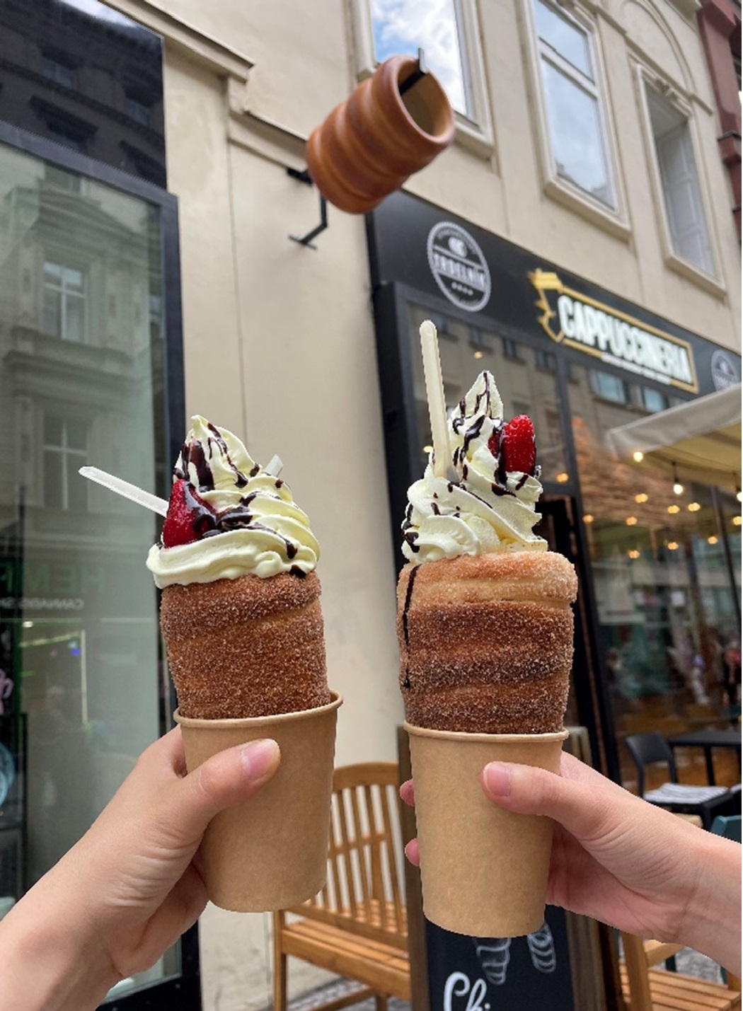 お昼はチェコ人の友達が教えてくれた、チェコ(スロヴァキア)の郷土料理「スマジェニースィール」を食べました。これはチーズに衣をつけて油で揚げる料理で、チーズの弾力が強く絶品でした。またデザートにはトルデルニークというスイーツにイチゴとアイスクリームがトッピングされたものを食べたのですが、ボリューミーで激甘なため二人で一つにすればよかったなと思いました。