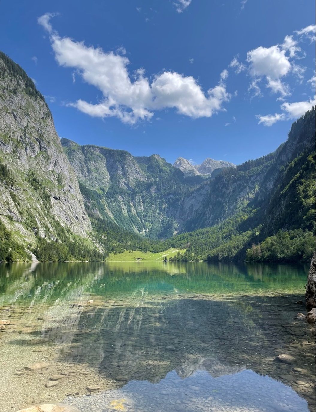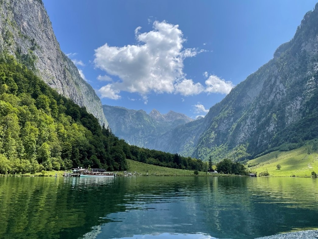 中でも特にケーニヒス湖は、美しい湖とアルプス山脈のコラボレーションが見られる、ドイツで人気の観光地だったので行くことに決めました。まず、ケーニヒス湖に着いたら湖を渡るための船のチケットを買いました。船に乗り込んだら美しい景観を眺めながらゆっくりと進んで行くのですが、この船に使われているモーターは環境に配慮した電気モーターのため、船らしい揺れは感じられず氷の上を滑っているのかと勘違いしてしまうほどに振動がありませんでした。そのため、三半規管の弱い友達も全く酔わずに1時間ほど船に乗れていました。その後、オーバー湖があるところで降り、ハイキングを楽しみました。周りをアルプス山脈が囲んでいるため360度美しい景色が広がっており、空気もおいしくて最高に贅沢なハイキングでした。