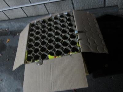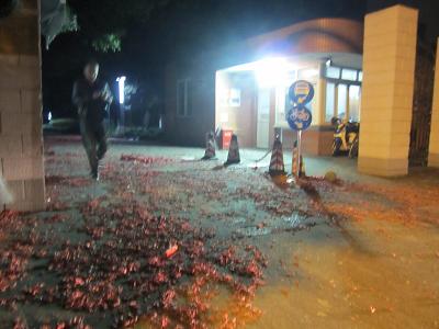 打ち上げが終わった後見に行くと、その近くは花火や爆竹の燃えかすが地面一面に落ち葉のように散らばっていました。打ち上げ花火の箱は、段ボールのような箱に打ち上げ花火の筒がたくさん入っているというような形です。