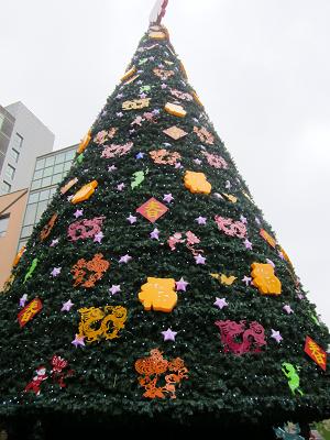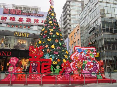 ここのメインの大きな飾り、なんとクリスマスに使ったツリーの飾りをお正月バージョンに変えただけ。このちょっとツッコミたくなるこの感じが中国っぽくて面白いんですけどね。