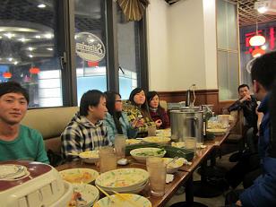 旧正月においての大みそかに当る日は、友人と2人で、夕飯を食べるため、頻繁に訪れるサイゼリアに行きました。中に入ると「今日はもう閉店だよー」「また明日ー!」と言われました。大みそかのため、この日は早めに店を閉め店員さんたちが忘年会をしていたようです。あきらめて帰ろうとすると、「待ってー!こっちに来て座りなよー」と言われました。良く通う店だったので、顔を覚えてくれていた店員さんが誘ってくれました。こうして、サイゼリアの忘年会に急きょ参加が決定しました。机には料理が並んでいたのですが、すべて中国の家庭料理でした。そのごはんも分けてもらえました。店員さん達は、知り合いに電話をかけてはスタッフ全員で声を合わせて「新年快乐ー!(あけましておめでとう!)」を言い、「聞こえたー?」というようなやりとりをずっとしていました。わたしたちもその「新年快乐ー!」に混ざりました。「君たちも日本の家族に電話しなよ!」と言われたのですが、私の携帯電話は国際通話が出来るような手続きをしていないので残念ながらできませんでした。