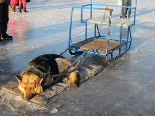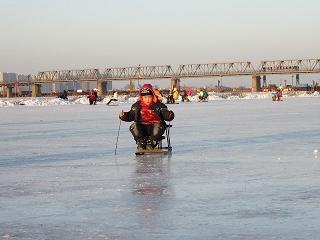ホテル近くの川は完全に氷がはっていて広場のようになっており、20元でそりを借りて遊んできました。他にも犬ぞりや氷上自転車、こまなど様々なものがあります。