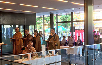 さらに大正大学の盆踊りで忘れてならないのが法要です。盆踊りの元々の由来が先祖供養であることから、仏教学を専攻する学生による施餓鬼法要といった仏教行事が行われます。また、盆踊りの休憩時間には、太鼓で有名な真言宗豊山派による奉納もあります。
