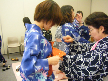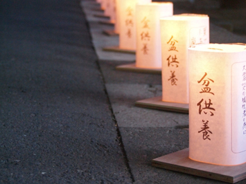 また太鼓も当時は、塩入先生のお寺から運ばれた小さな太鼓一台だけでした(写真2)。盆踊りで必要な小道具もすべて学生たちが一から手作りしたものを使用していました。一方大きな問題として、盆踊りを映えさせる浴衣の着付けを学生だけではできないことがわかりました。しかし、盆踊りの練習会で踊り方を教えていただいた「つぼみの会」に事情を話したところ、すぐに着付け教室を開いてもらいました。今でもつぼみの会の方々には大変ご協力をいただいておりますが、当時から快くお引き受けいただき当日の着付けが実現しました(写真3)。 追悼行事として欠かせない灯籠も、今と変わらず礼拝堂から正門まで一列に灯篭を並べていました。この灯籠も、関わった学生や地域の方々一人ひとりに専用の和紙に言葉を書いてもらい、一つひとつ手作りで作りました(写真4)。