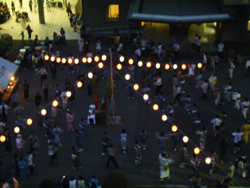 当時は「鴨台盆踊り」という名称ではありませんでした。追悼の意味を込めて「みたま祭り」と称していました。特徴的なのは、今でこそ当たり前のようにある大きな櫓がないことです。何を使用していたかというと学生達と装飾した一本の竹を櫓の代わりとし、竹のポールを中心に提灯を下げ、その周りに盆踊りの輪をつくり踊っていました(写真1)。
