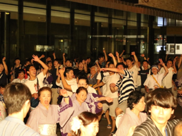 盆踊りが中盤に差し掛かかる頃、ゲリラ豪雨のような雨がザーッと降ってきました。そのとき、こちらの指示を出さないうちにMCをしていた学生が3号館の中に入ってくださいと呼びかけていました。会場内は混乱していたのですが、盆踊りを先導してくださる坂東扇太惠先生から「すぐに曲かけて! 踊るよ」と言われて曲をかけた瞬間、みんな吹き抜けを櫓に見立てて一斉に踊り始めました。これによって秩序が戻ったことが強く記憶に残っています。当日は準備段階から本番まで、全員が臨機応変に対応できて素晴らしい盆踊りになったと思います。