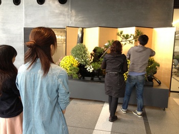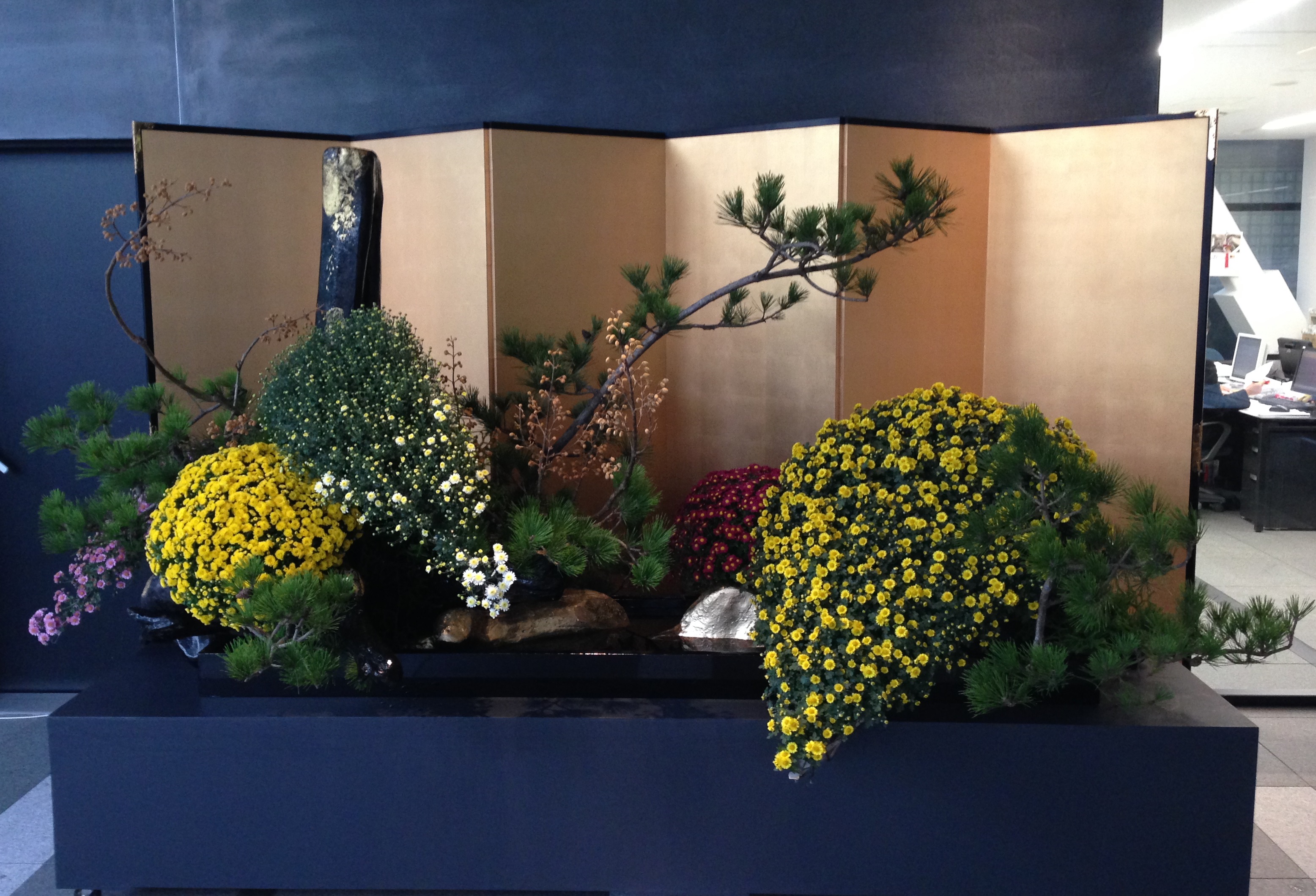 今回は、「すがも中山道菊まつり」の開催に合わせて、菊を使った琳派調いけばなを展示しています。