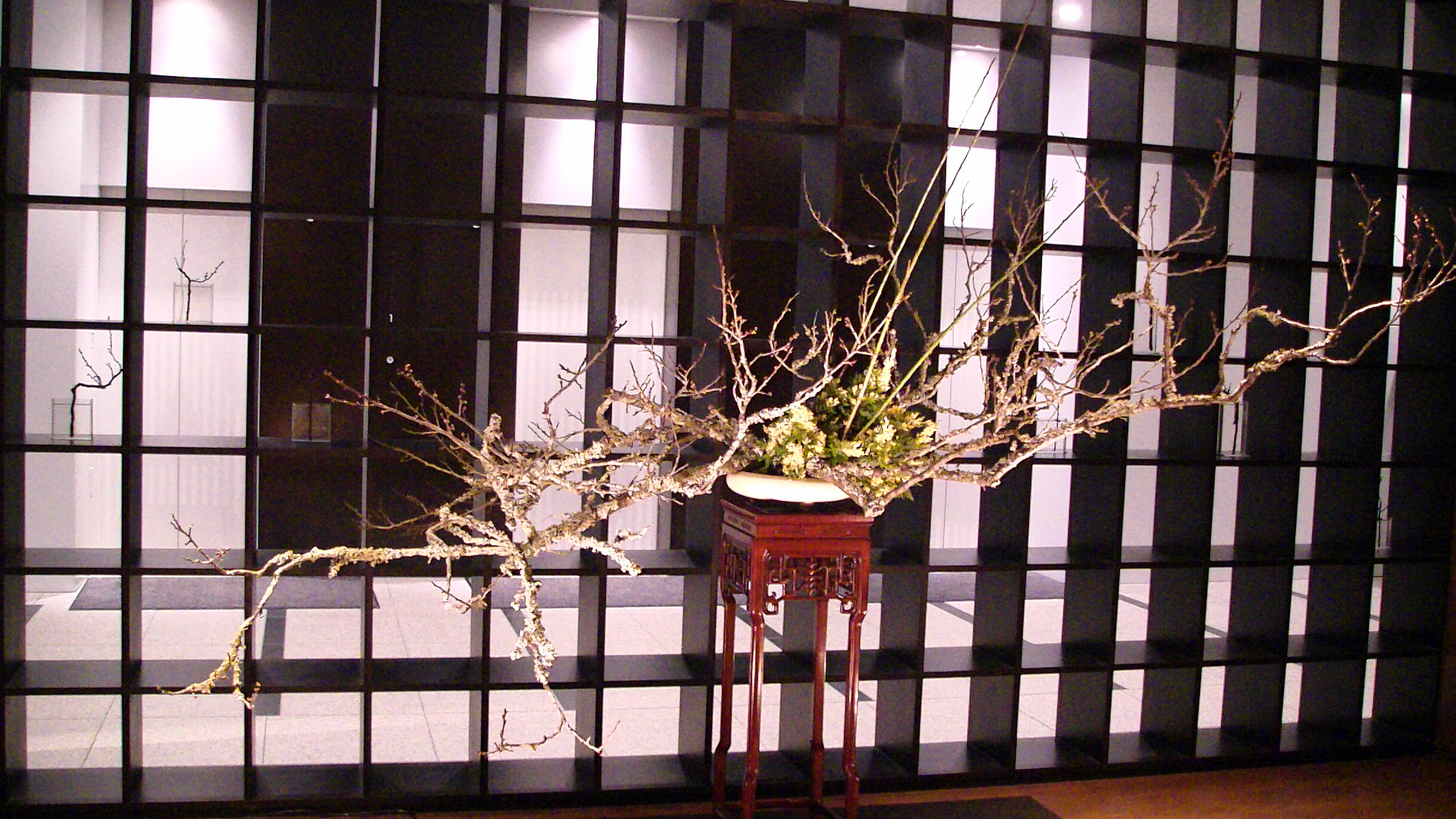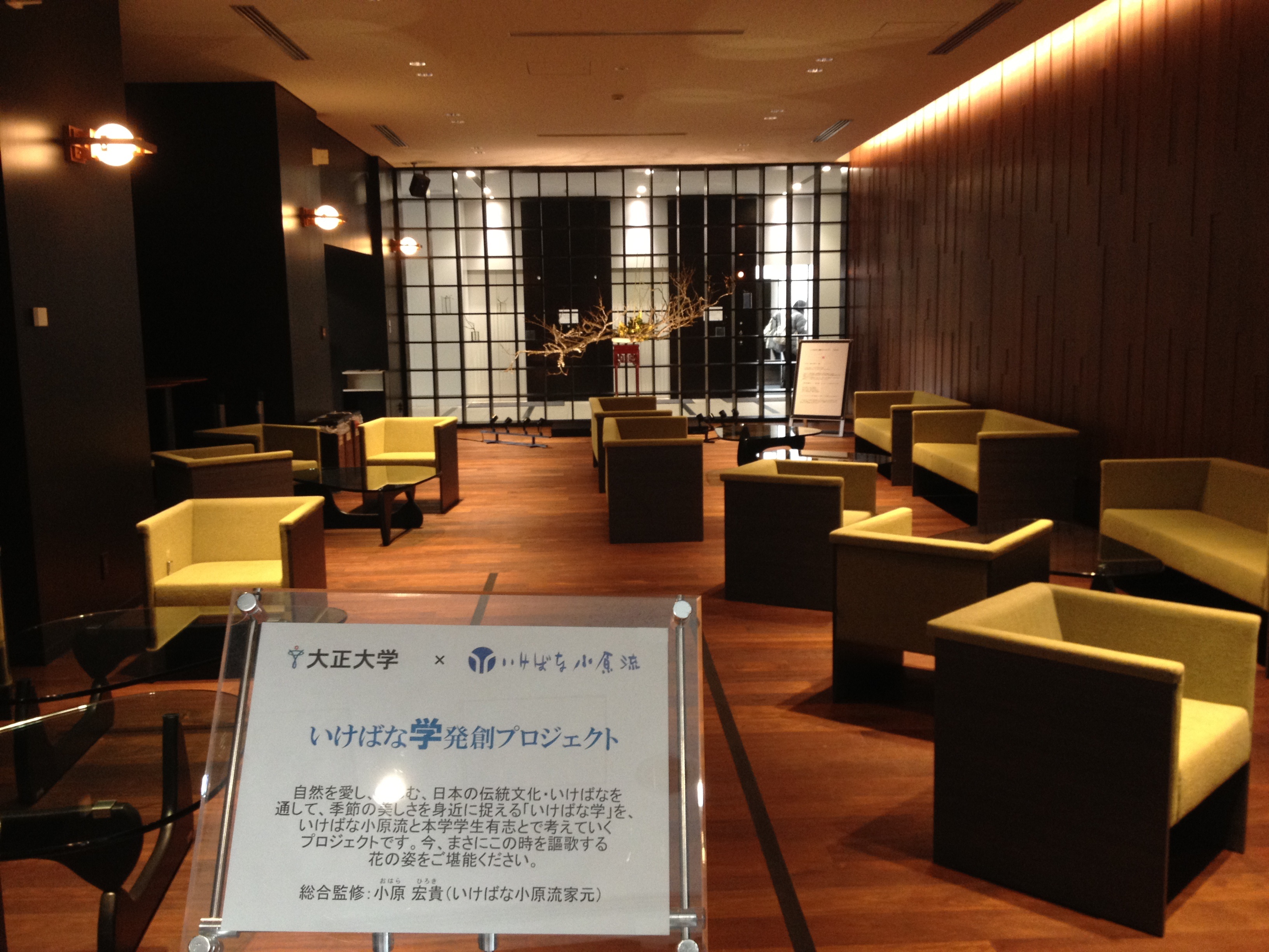 現在、本学客員教授 小原流家元 小原宏貴監修によるいけばな作品が展示されています。