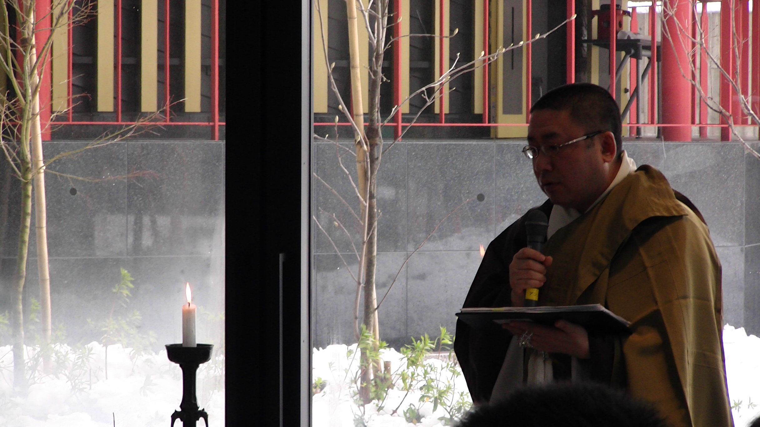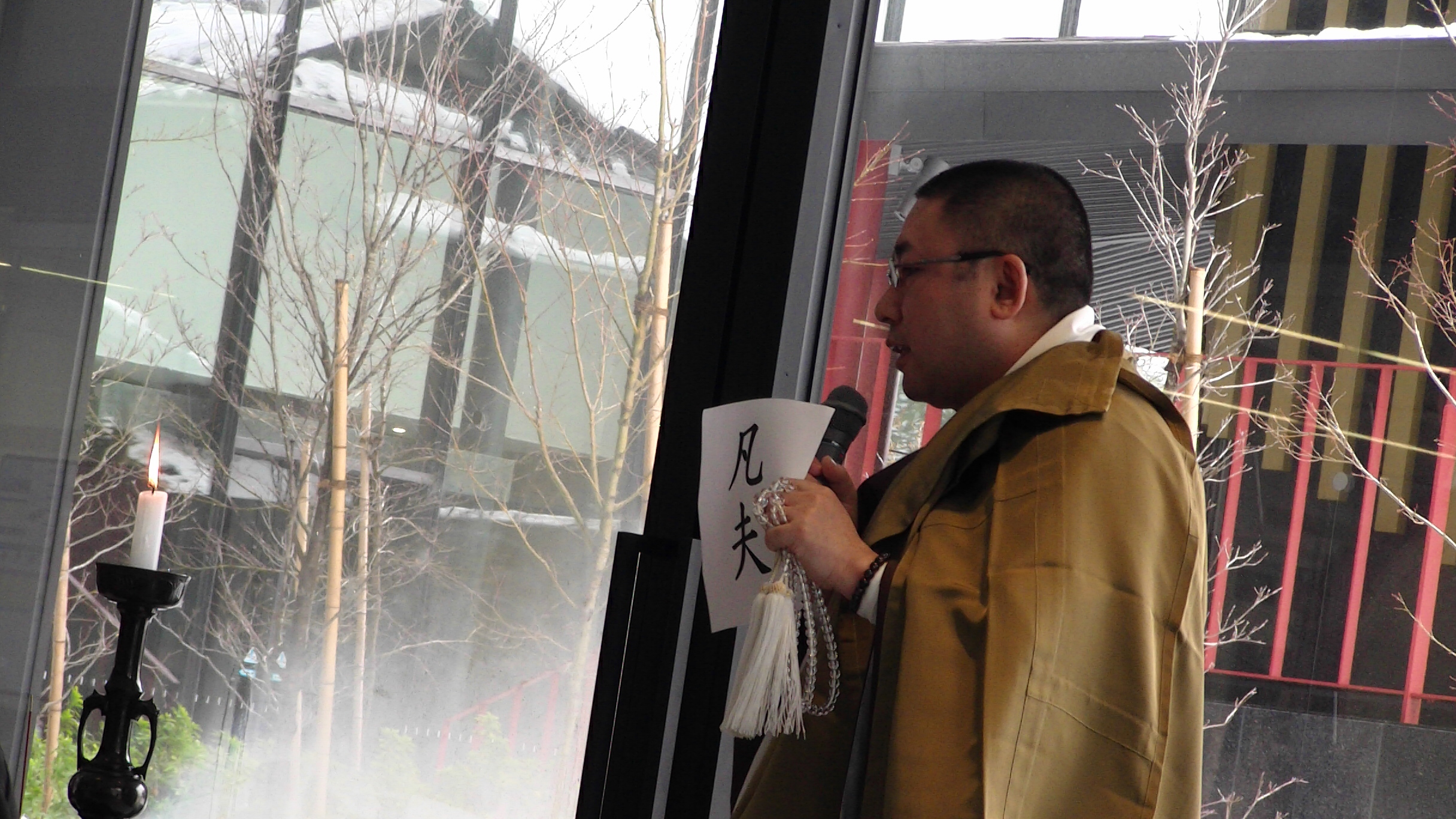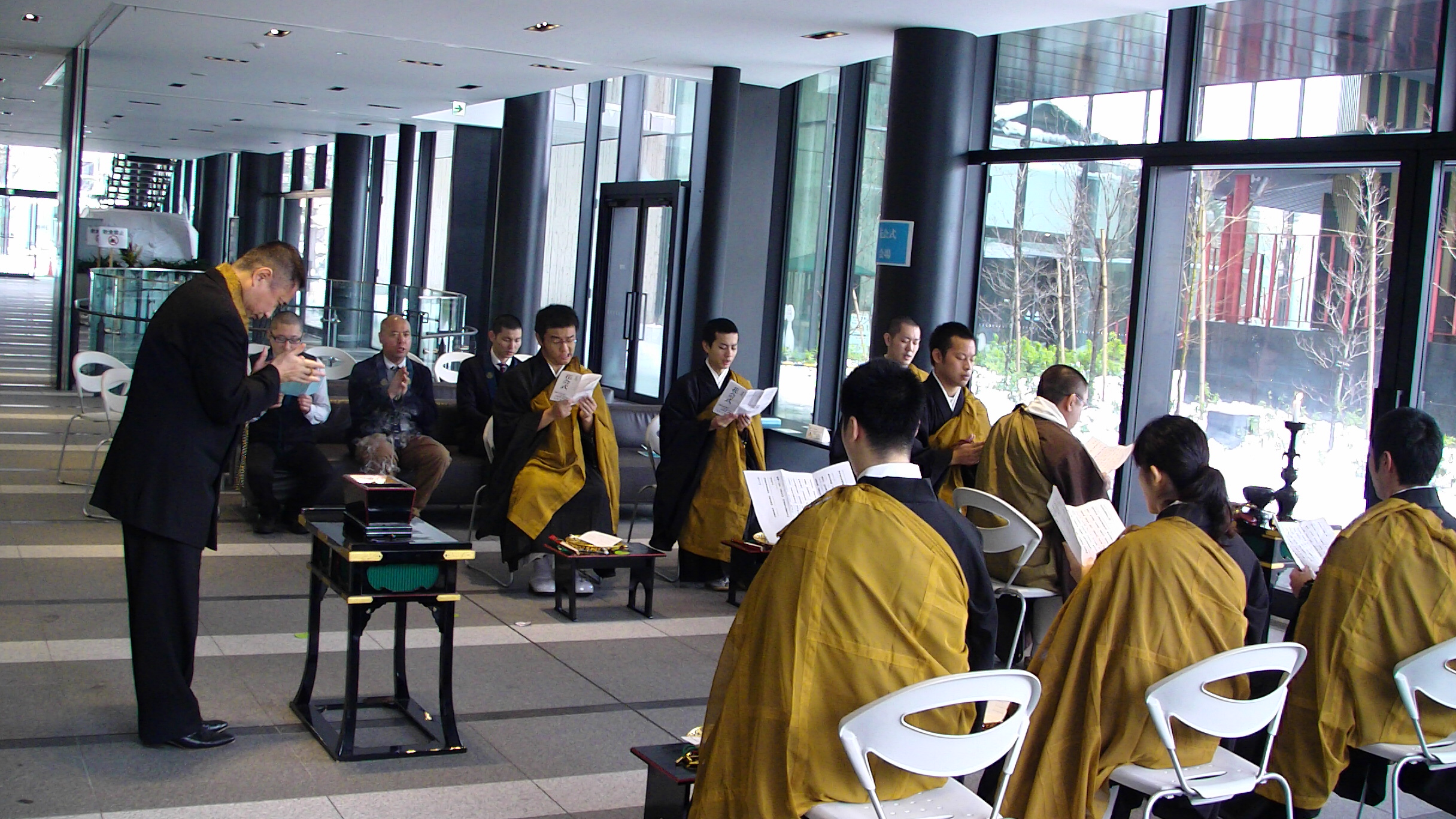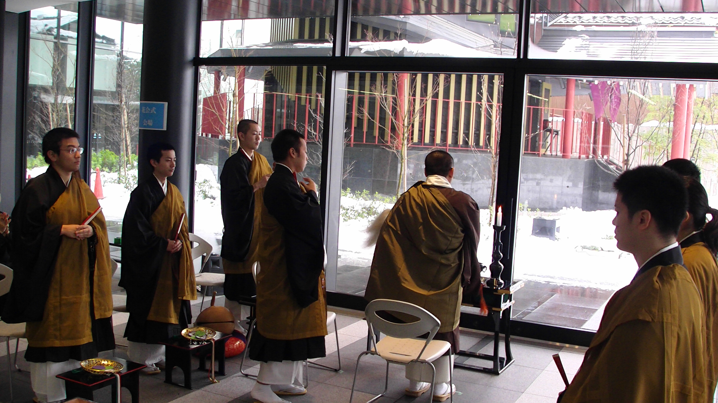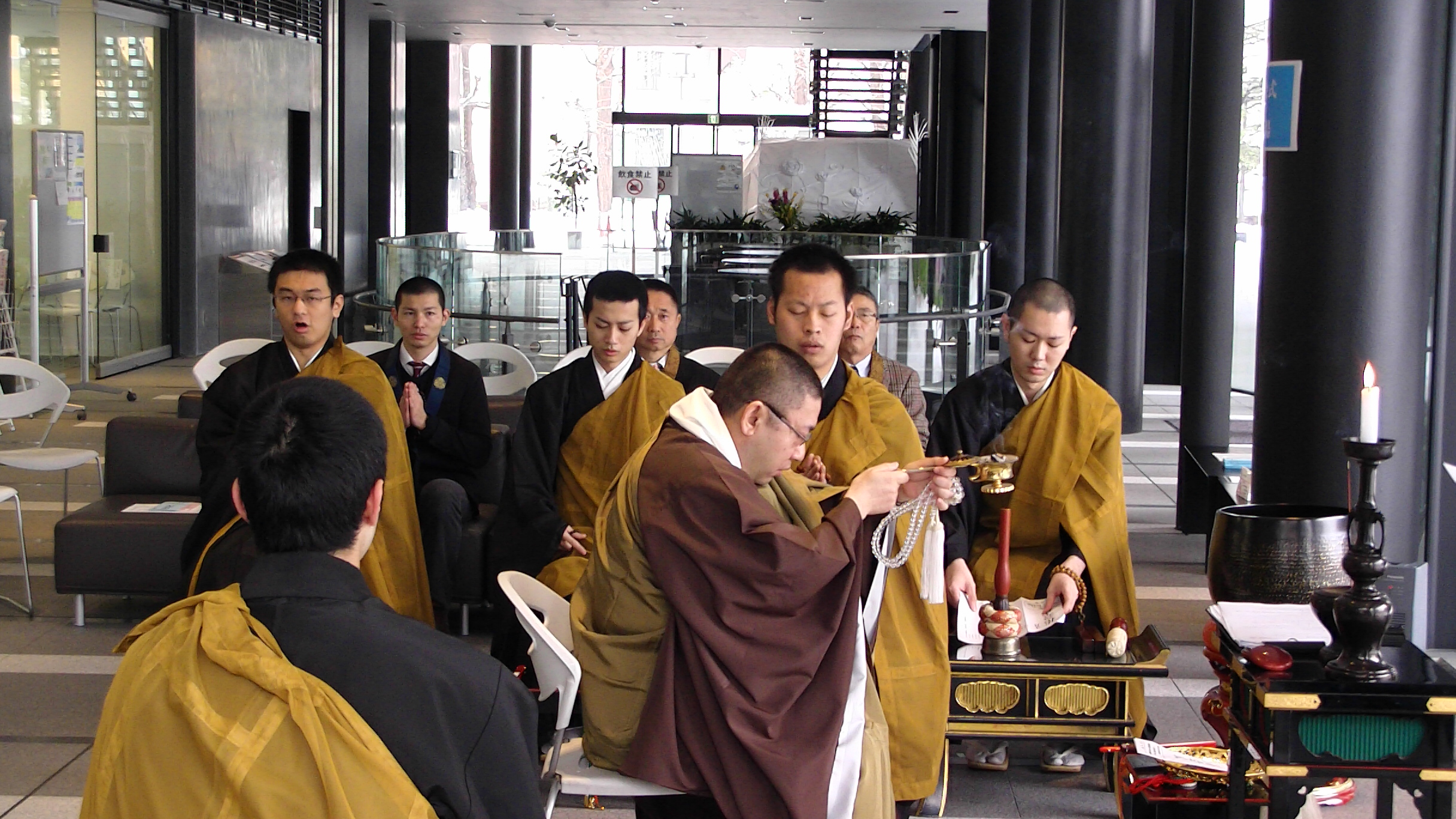 先生や学生は早めにかけつけ、法要の会場を建物内に移して定刻通り開催することができました。