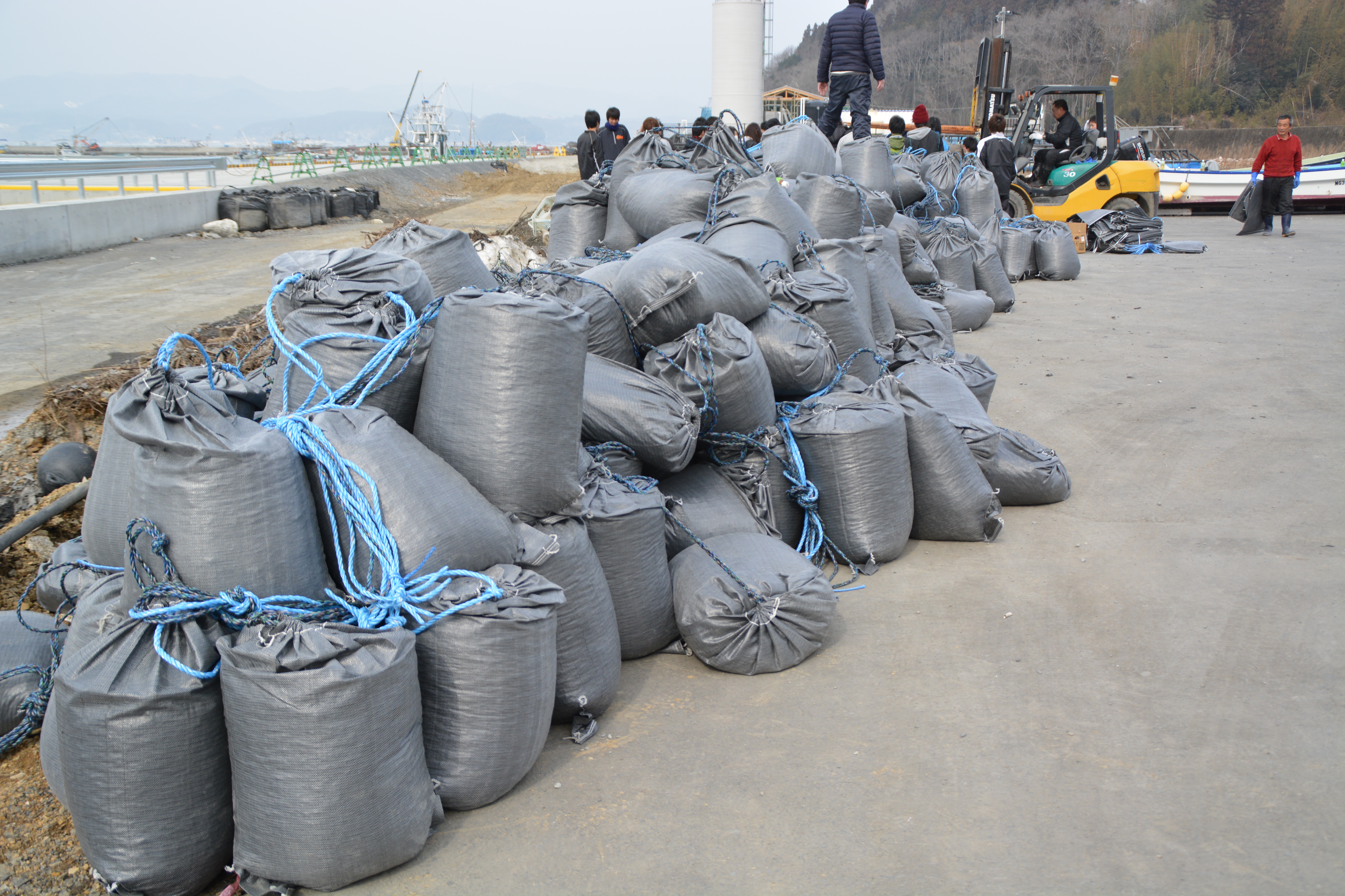 鮭を養殖する網が浮き上がらないようにするための土嚢です。