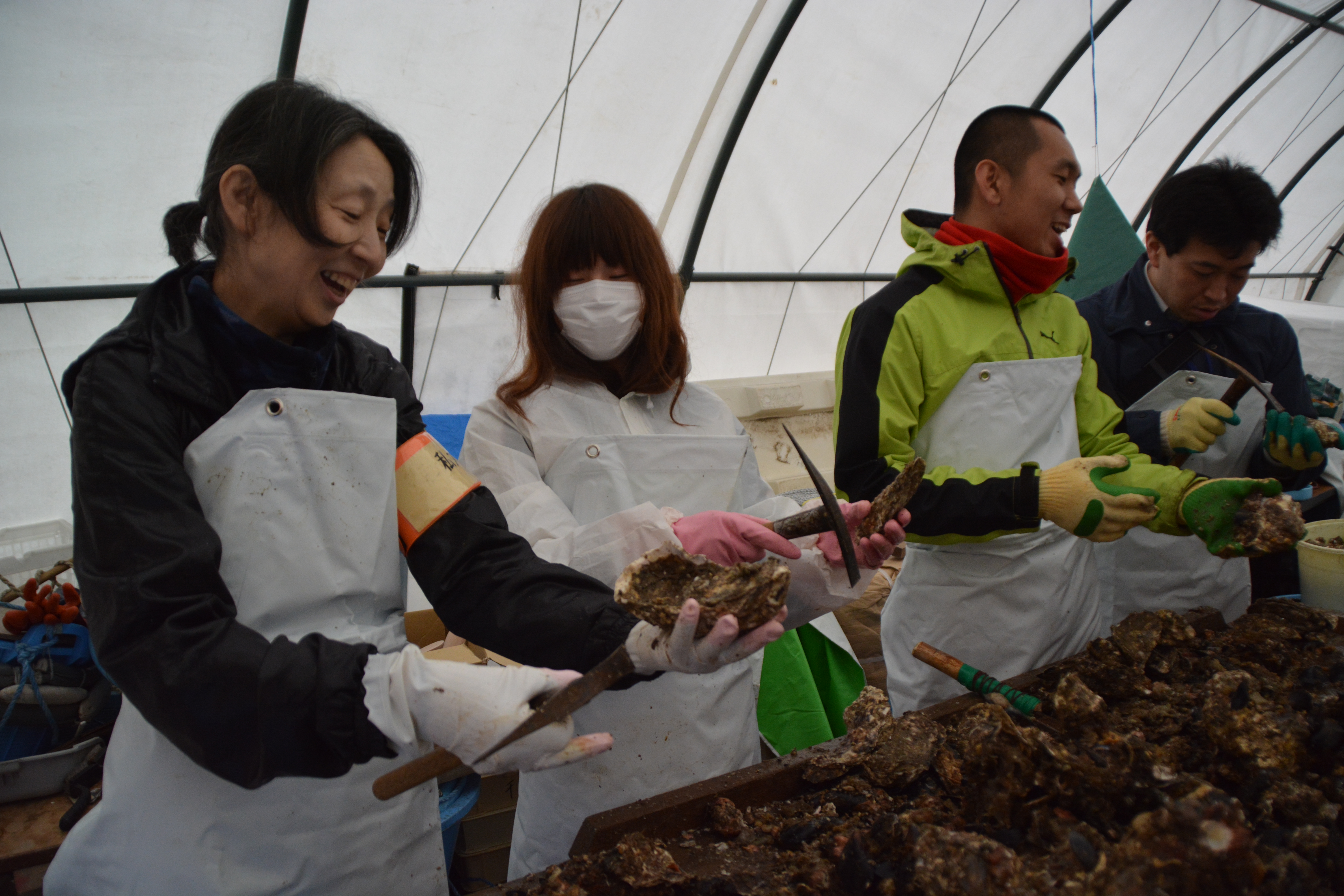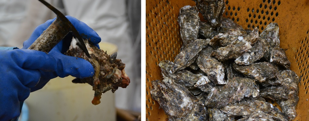 商品として販売するため、カキの殻についたフジツボをはがしたり