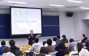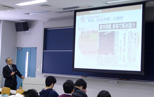 今回の初回授業は、高野之夫客員教授(豊島区長)に講義していただきました。テーマは「区長として、取り組んだ財政再建と未来への視点」。講義の内容を一部ご紹介すると、『豊島区の「人口減少」という課題を解決するためには、「住みたいまち」づくりの推進による定住人口の確保が必要であり、単身者向きの狭小住宅が多い豊島区の住宅環境を新税の導入によって改善、ファミリー層が住みやすい住宅の建築が増加した』ことなど、豊島区の様々な課題を事例に区長が手掛けてこられた政策をご説明いただきました。行政のリーダーによるお話を伺い、学生たちは豊島区についてじっくりと考える機会を得ることができました。