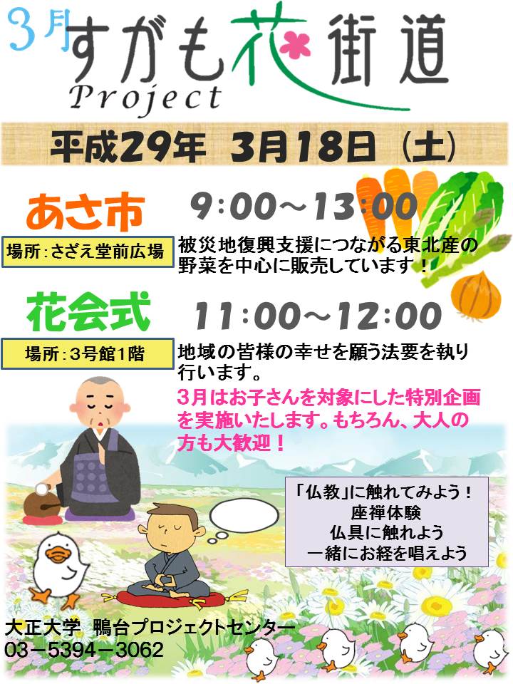 日時:平成29年3月18日 (あさ市 9:00~13:00 ・ 花会式 11:00~12:00) 場所:大正大学さざえ堂前広場