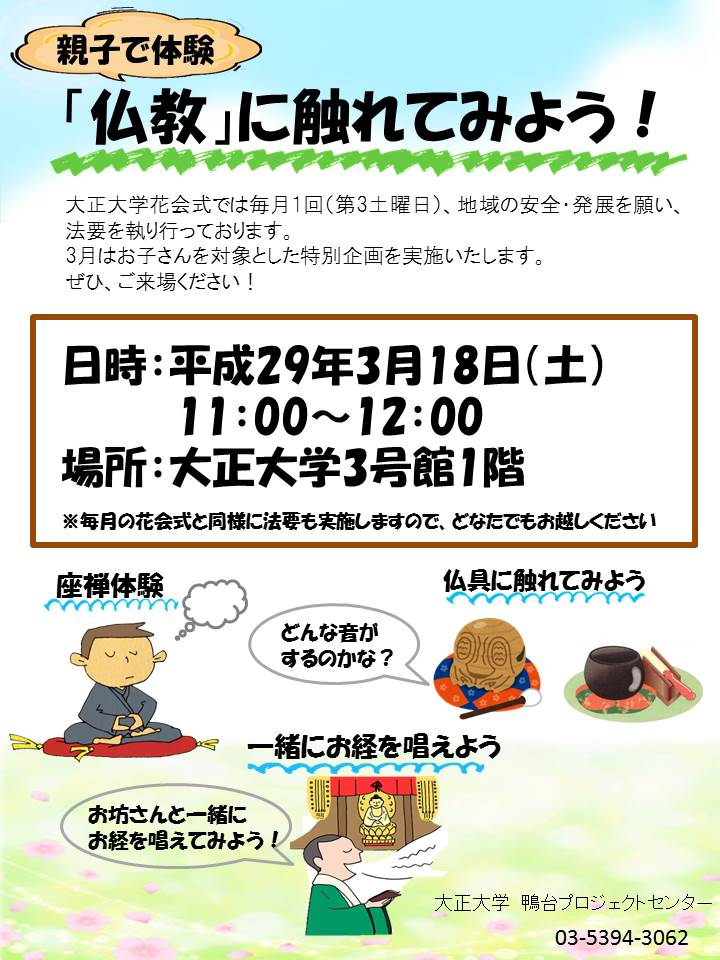 日時:平成29年3月18日(土)11:00~12:00 (3月「あさ市」と同日開催) 場所:大正大学3号館1階 当日は、普段あまり触れる機会がない「仏具」に触れたり、座禅体験を実施します。 皆様のご来場をお待ちしております!