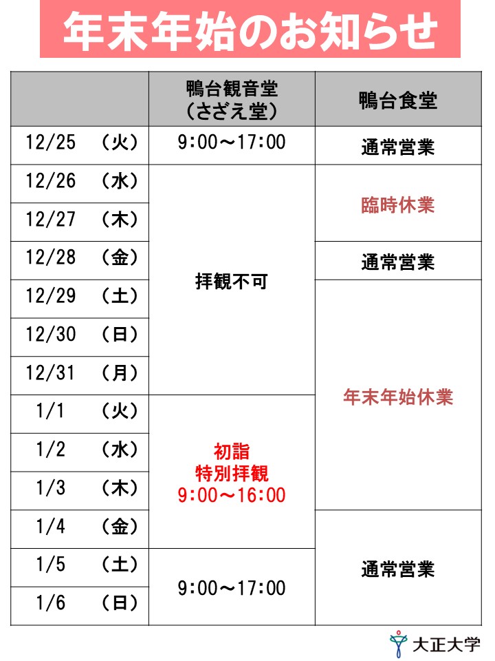 年末年始のさざえ堂・鴨台食堂につきましては、以下の通りとなります。