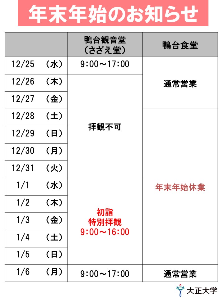 年末年始のさざえ堂・鴨台食堂につきましては、以下の通りとなります。