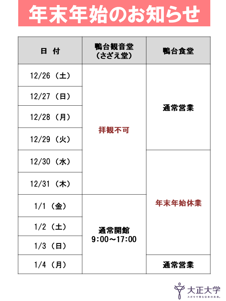 年末年始のすがも鴨台観音堂(さざえ堂)・鴨台食堂につきましては、以下の通りとなります。 ※原則として、その他施設は立ち入りできません。