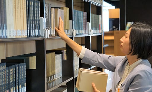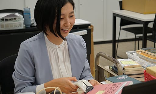 研究・教育に活かせる資料の収集から管理・修理をする受入整理業務と、資料の貸出・返却、情報検索の補助をする閲覧業務(カウンターサービス)です。現在は、閲覧業務を中心に行っています。
