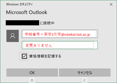 Outlook起動後に再認証を求められる場合は、「odaikai.tais.ac.jp」での認証をお願いします。